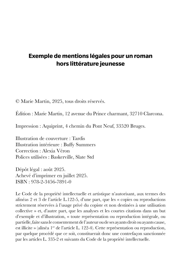 Ci-dessous, vous trouverez un exemple créé pour l’occasion de mentions légales telles qu’elles peuvent apparaître dans un livre.